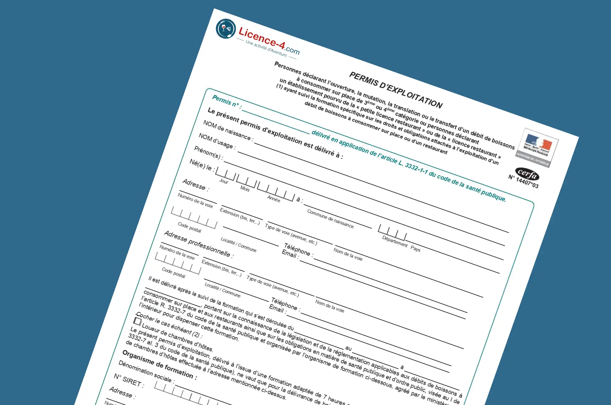 Le permis d’exploitation est ni plus ni moins qu’un document officiel. Il porte le numéro 14407. Il vous sera remis, à l’issue de la formation, sous réserve d’une assiduité durant la durée de la formation.